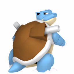 Blastoise is a large, bipedal, reptilian Pokémon. It has a blue body with small purple eyes, a light brown belly, and a stubby tail. It has a large brown shell with two powerful water cannons on either side, which can be withdrawn.